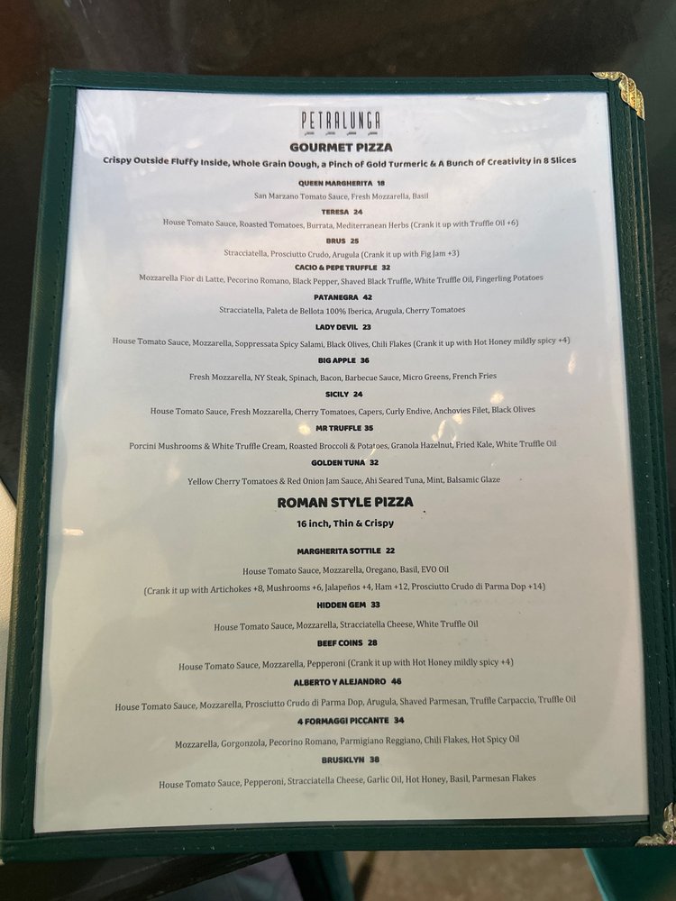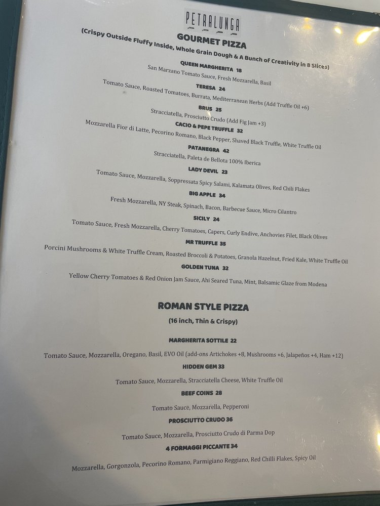 inch pizza, tomato sauce, mozzarella, prosciutto crudo di parma dop, arugula, shaved parmesan, truffle carpaccio, truffle oil